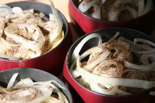 Сверху укладываем баклажан(пару колец) и обильно лук, опять таки кольцами.