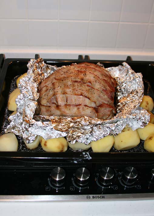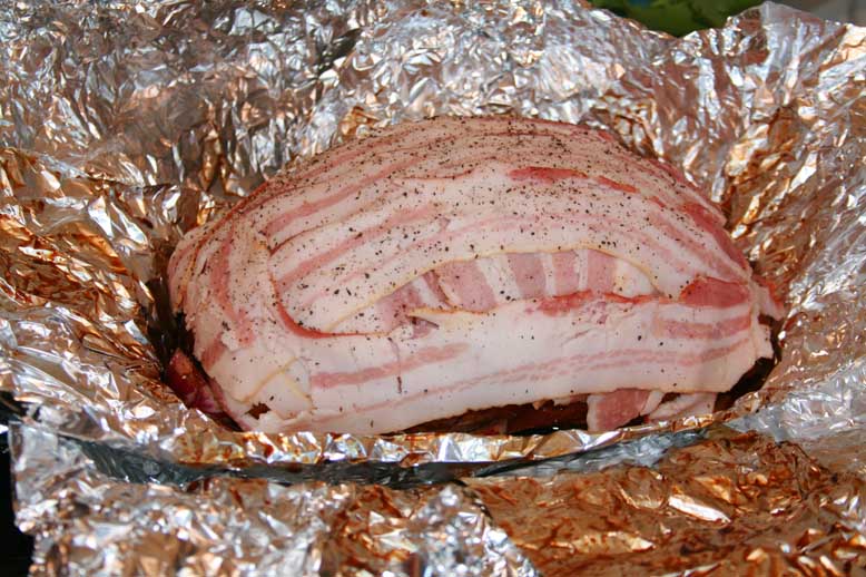 На день рождения своей любимой задумал я приготовить брутальное блюдо. И осмелился на запекание ростбифа. И так! Был закуплен кусок говядины — оковалок с редкими вкраплениями жирка весом два с половиной кг. С вечера предыдущего дня этот кусок был нежно натерт солью, перцем и готовым соусом для барбекю (куплен в МЕТРО) и оставлен отдыхать до следующего дня в нулевой камере холодильника. По утру наш кусок подвергся шпигованию чесноком и выложен на противень с несколькими слоями фольги. После чего покрыт тремя слоями полосок подкопченного бекона. Плотненько укутав фольгой будущий ростбиф был помещен в духовку с температурой 200 гр.це. По прошествии полутора часов мясо распеленал и обложило картофелем. Снова духовка со 180 градусами, на час. По окончании этого времени ростбиф разрезал и о май гат! Внутри кровь (!!!) Два с половиной часа оказалось мало для такого кусочка.