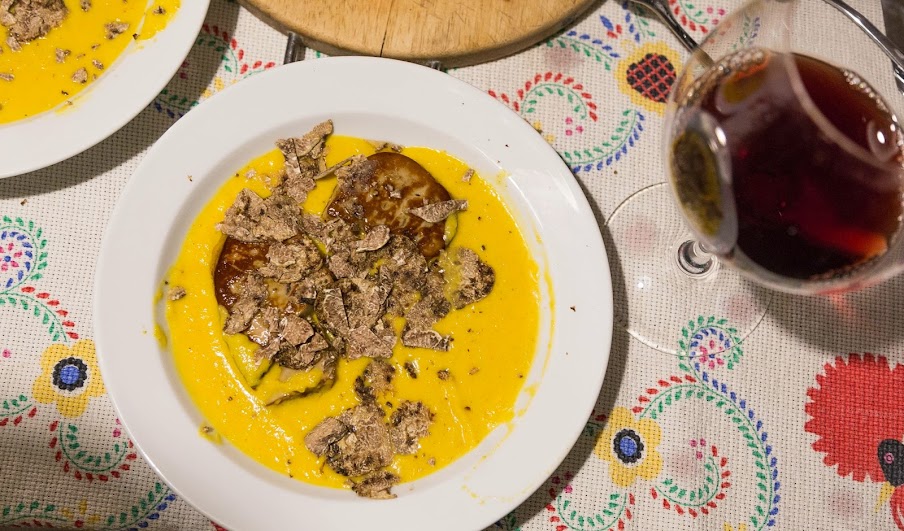 Vellutata di zucca con foie gras e tartuffo bianco