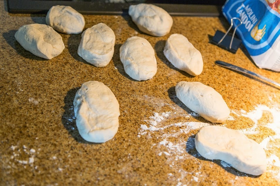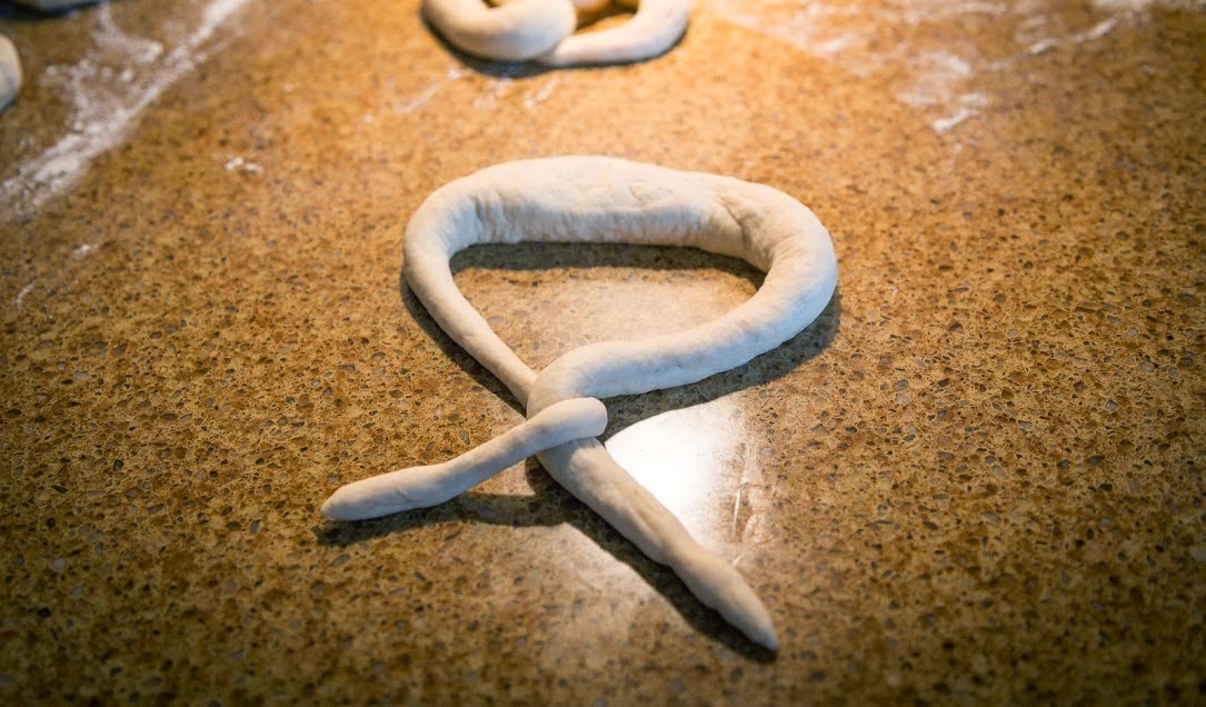 Следующим шагом разделяем тесто на примерно стограммовые куски для заготовок брецелей, или в половину от того, для Лаунгебротов менее накрученных.