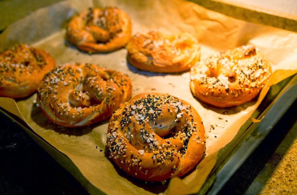 и перемещаем на противень покрытый слегка присыпанной мукой бумагой для выпечки. Где украшаем и добавляем дополнительные вкусы. Я для тестовой премьеры использовал раздельно семена укропа, кинзы (кориандр) тмин,кунжут. Ну и максимально крупную соль на каждый.