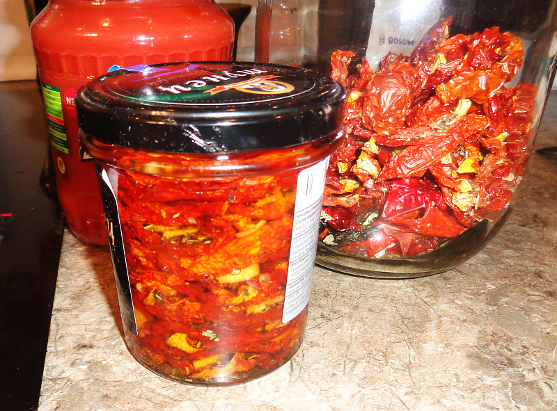 потом добавляются помидоры трех видов: свежие; вяленые — в масле с чесноком; консервированные в собственном соку.