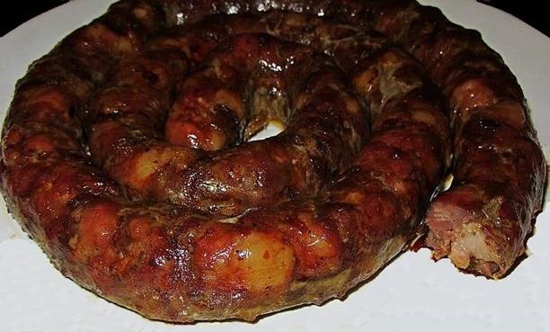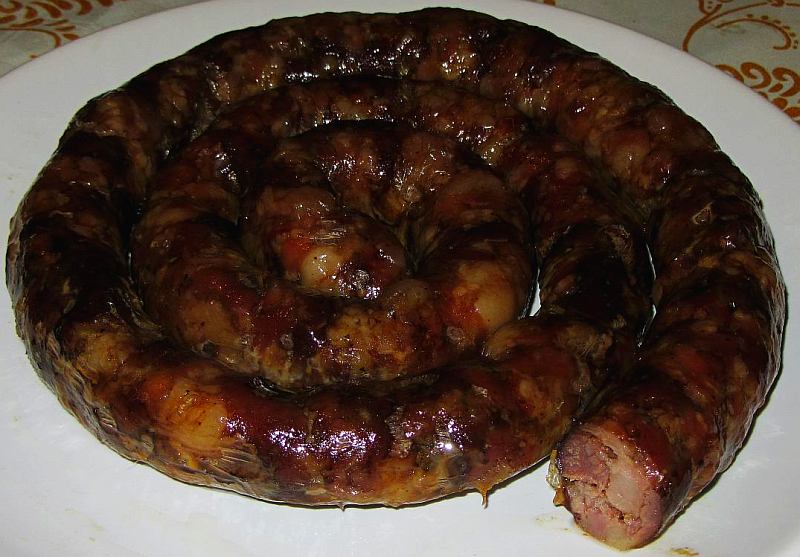 После набивки колбасу можно заморозить, а нужное количество — сразу пожарить в духовке (и тоже потом можно заморозить или, предварительно залив колбасу растопленным смальцем* и охладив, просто хранить в холодильнике, откусывая время от времени нужные кусманы и грея их в микроволновке или кидая порезанную — в утреннюю яишню с кохвием).