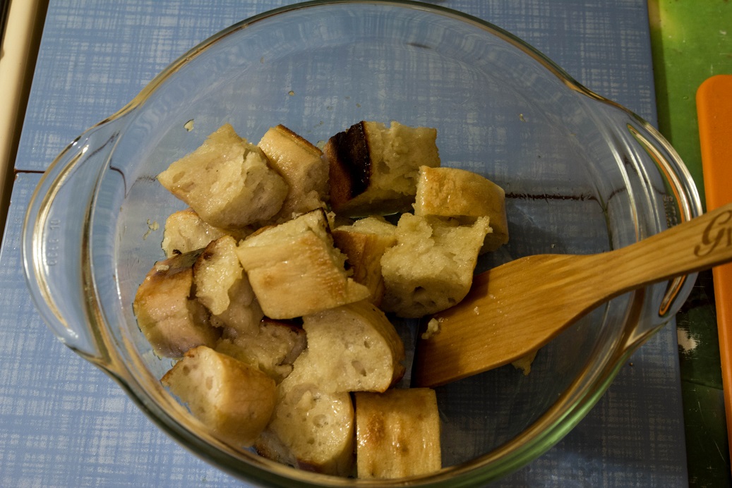 2/3 батона чиабатты режем на крупные куски, кропим оливковым маслом