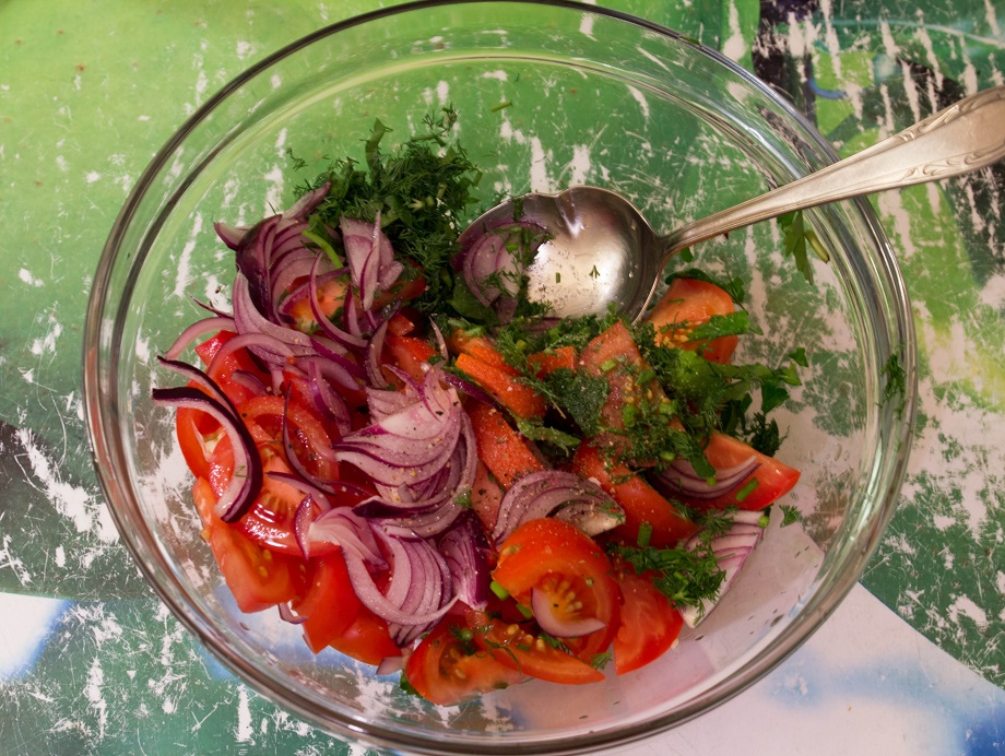 сверху помидоры, на них огурцы, маслины, каперсы.