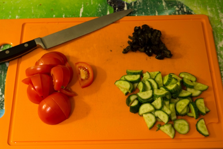помидоры режем крупно, огурцы тонко, маслины давим, косточки выбрасываем, оставшееся нарезаем.