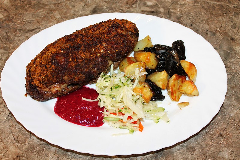 — вырезка, замаринована в тех же ништяках, запанирована в муке и пожарена с луком, штоб было чем закусывать пока готовились первые два пункта.