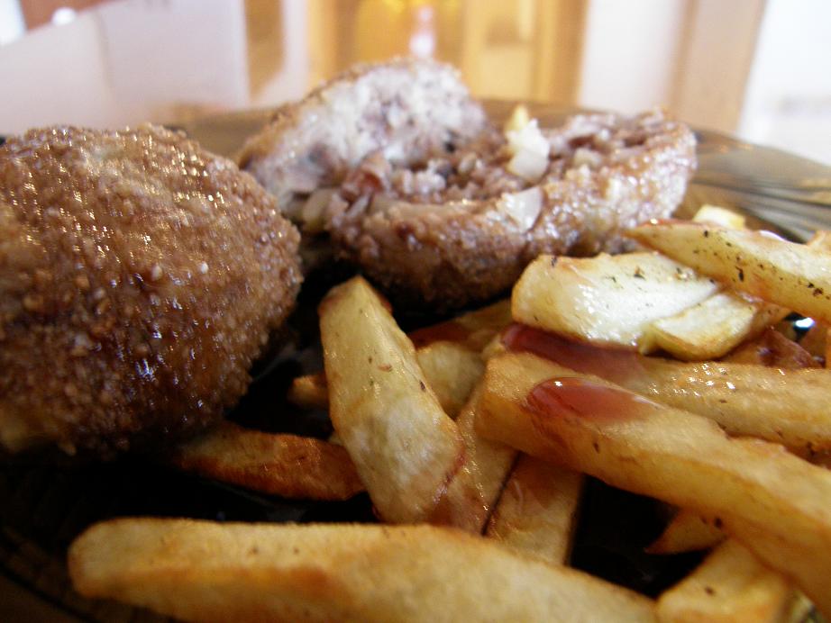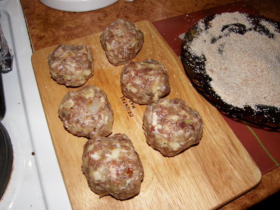 Лук… Мелко наструган и обжарен.В фарш, ибо сухой магазинный добавлено молоко, и мелко рубленная грудинка. Затем добавлен обжаренный лук.