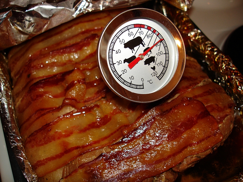 Противень, фольга, подушка из лука, проклаживаем беконом, маринад с мяса счищаем, кладем, закрываем беконом, потом фольгой и в печь пихаем.